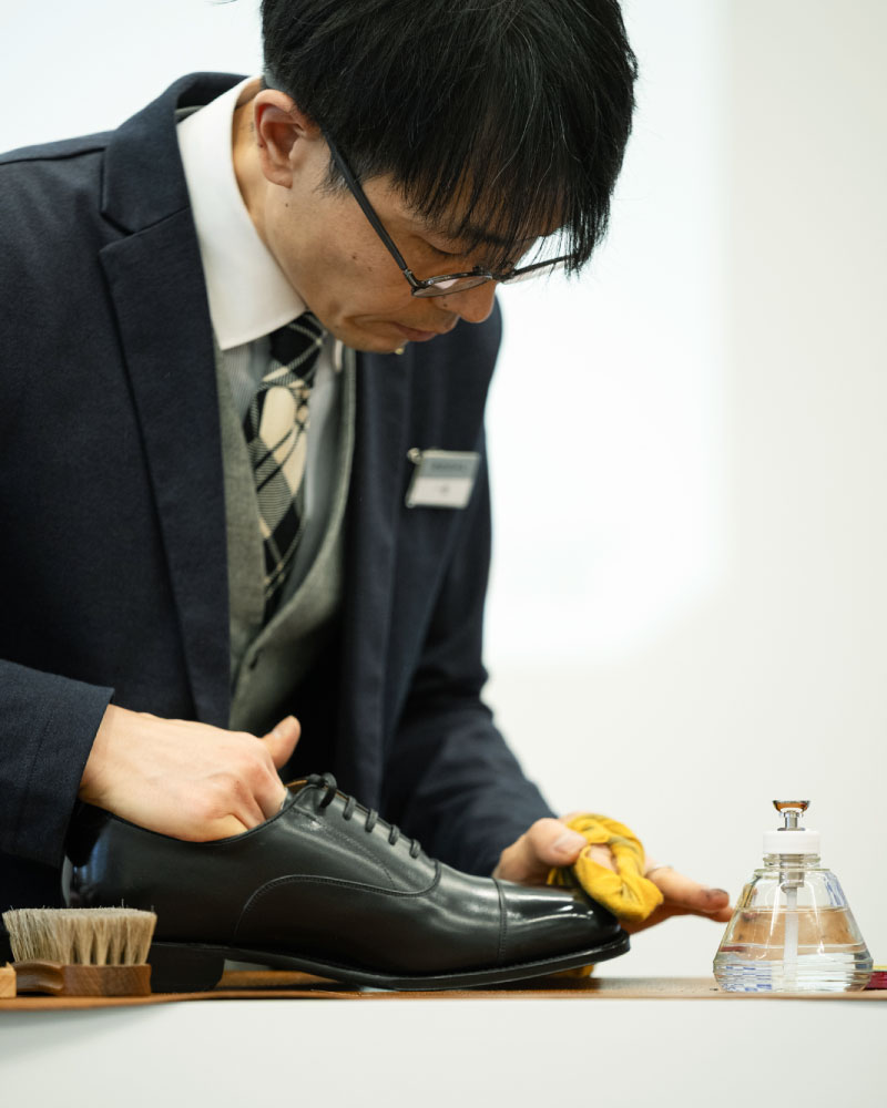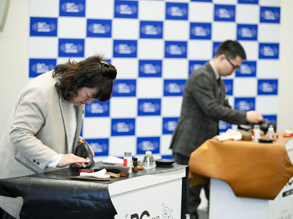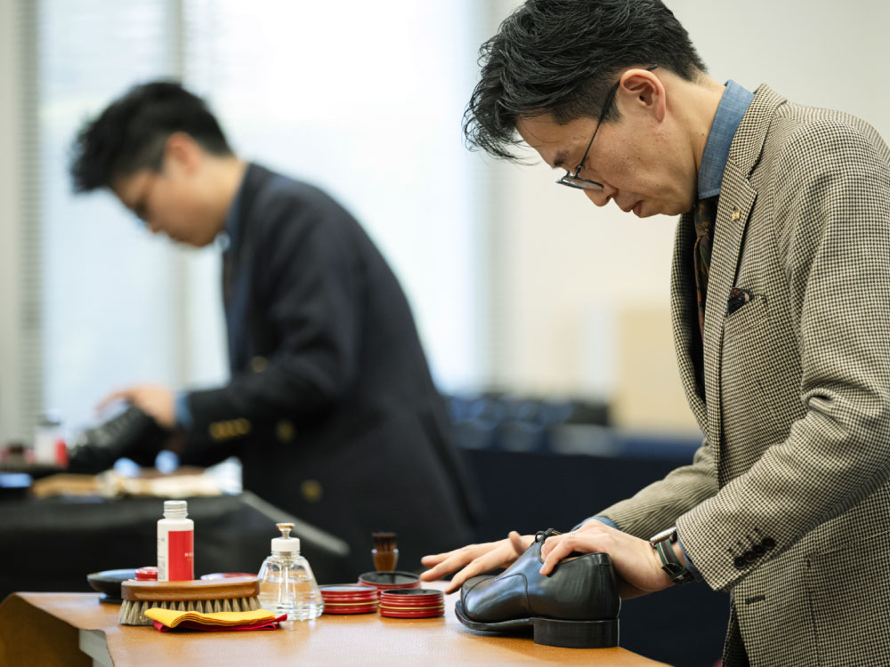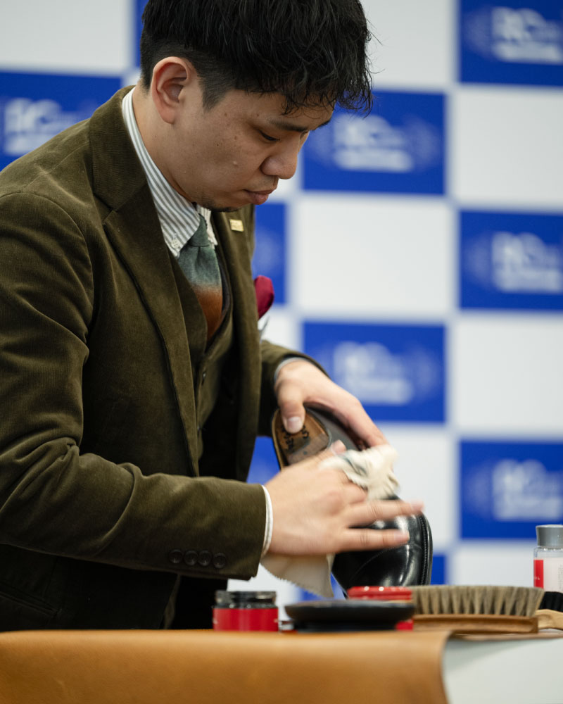 シューケアサービスの一連の流れを、店舗を想定したロールプレイング形式で行い、お客様の思いに応える接客力(接客ポイント)と「靴磨きの技術(テクニカルポイント)」の合計点で競い合う部門。決勝大会は、接客+プレメンテナンスとハイシャインのメニューを25分以内に行います。