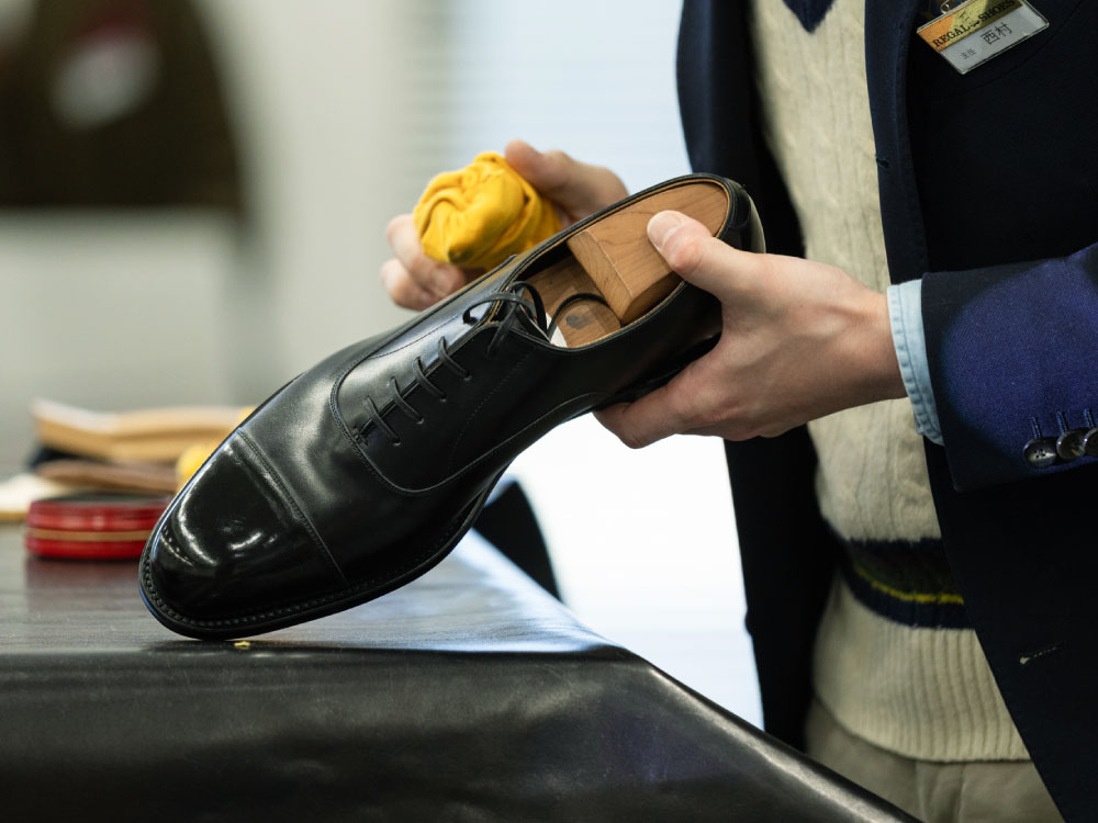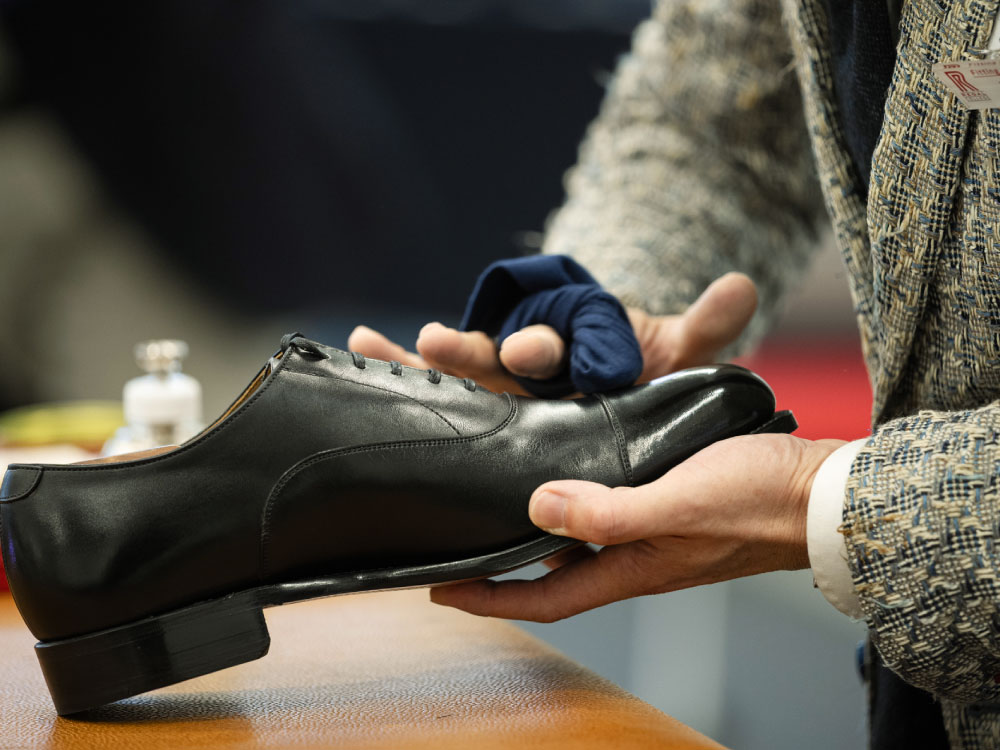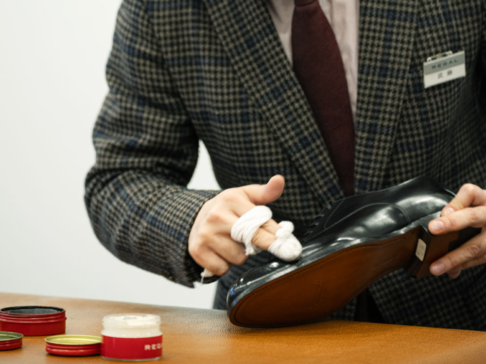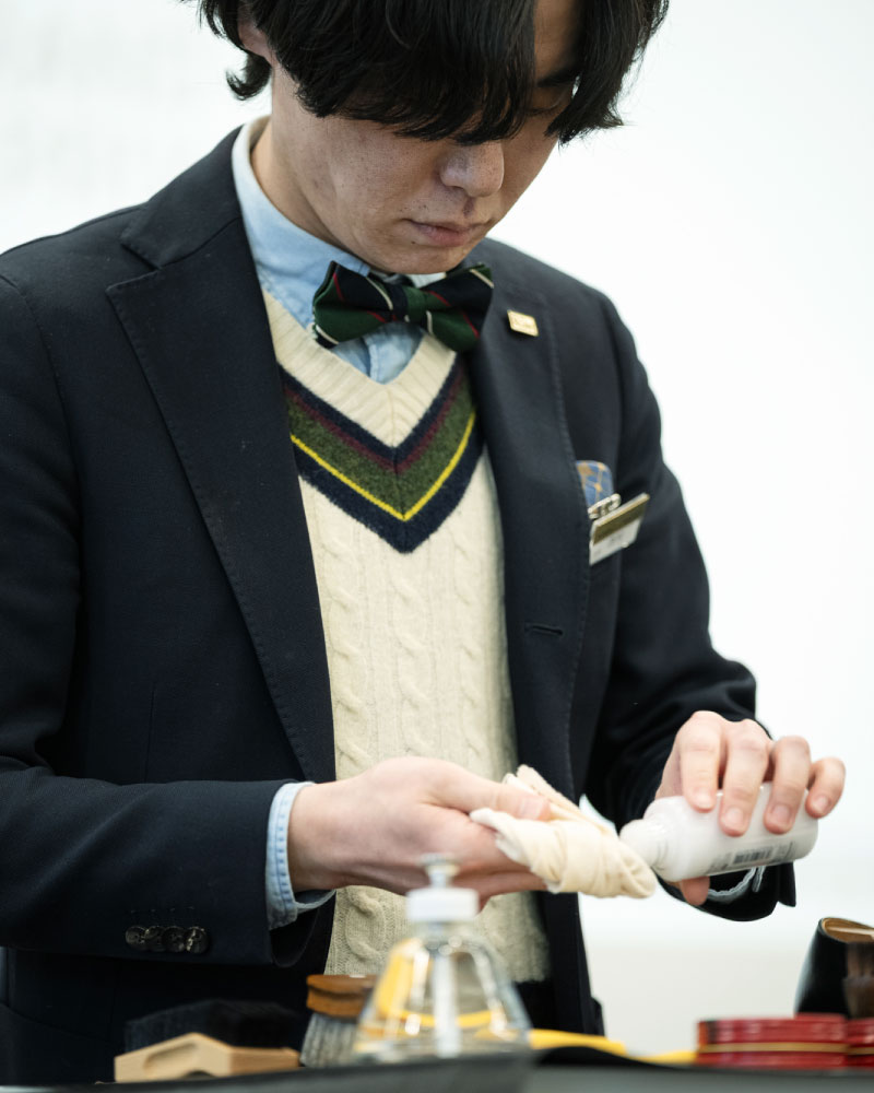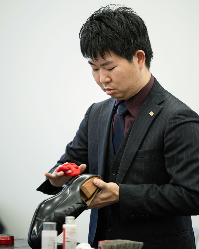 シューケアサービスの一連の流れを、店舗を想定したロールプレイング形式で行い、お客様の思いに応える接客力(接客ポイント)と「靴磨きの技術(テクニカルポイント)」の合計点で競い合う部門。決勝大会は、接客+プレメンテナンスとハイシャインのメニューを25分以内に行います。