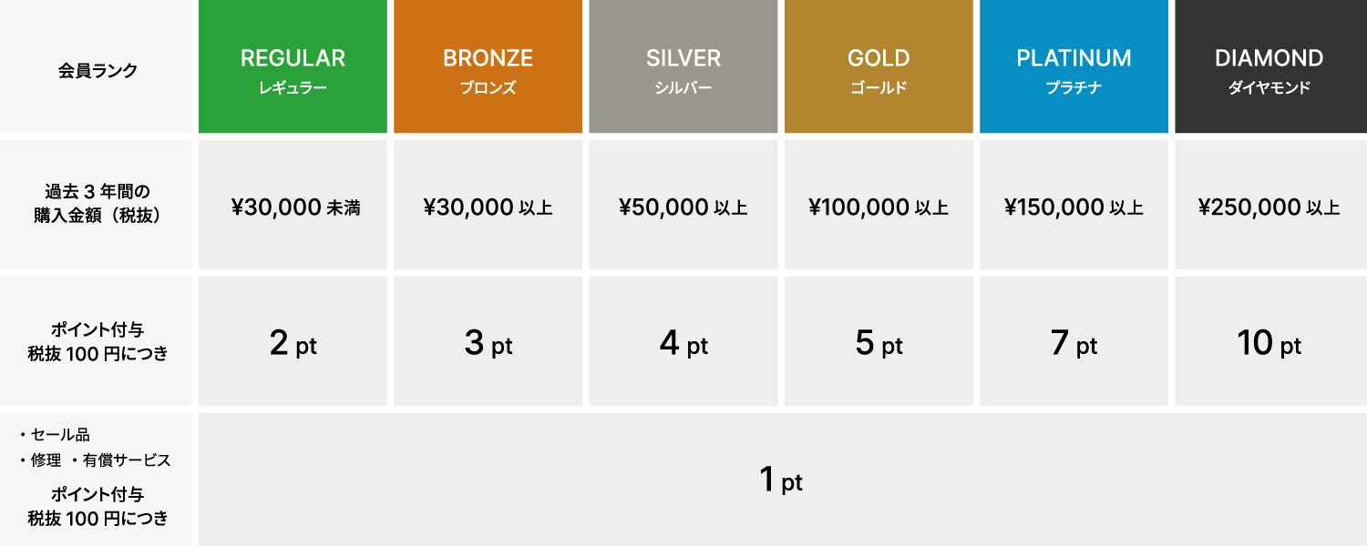 ・6月30日と12月31日の年に2回の判定日から直近3年の累計ご購入金額(税抜)によって会員ランクが自動変動します。