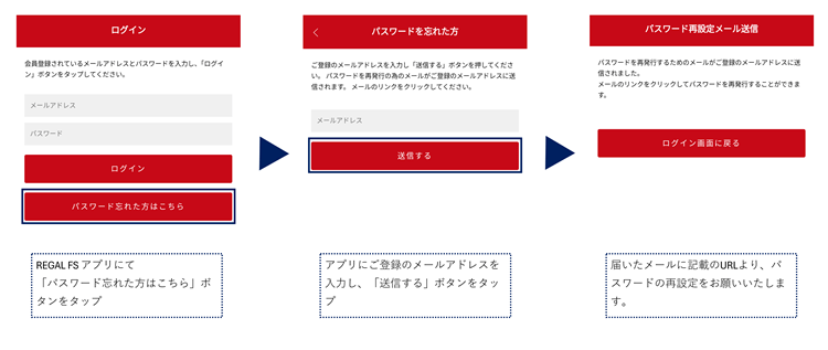 ①REGAL FS アプリにて「パスワード忘れた方はこちら」ボタンをタップ。
