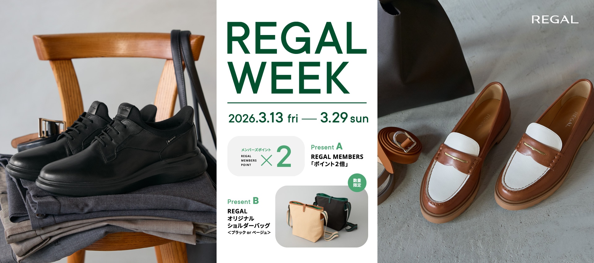 ※3月13日(金)~ 3月29日(日)の REGAL WEEK 期間中は、REGAL MEMBERS「ポイント2倍」、「REGAL オリジナルショルダーバッグ」、「オリジナルフレグランス」のいずれか1点をお選びいただけます。