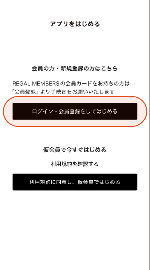 1アプリを開きログイン・会員登録をしてはじめるをタップ