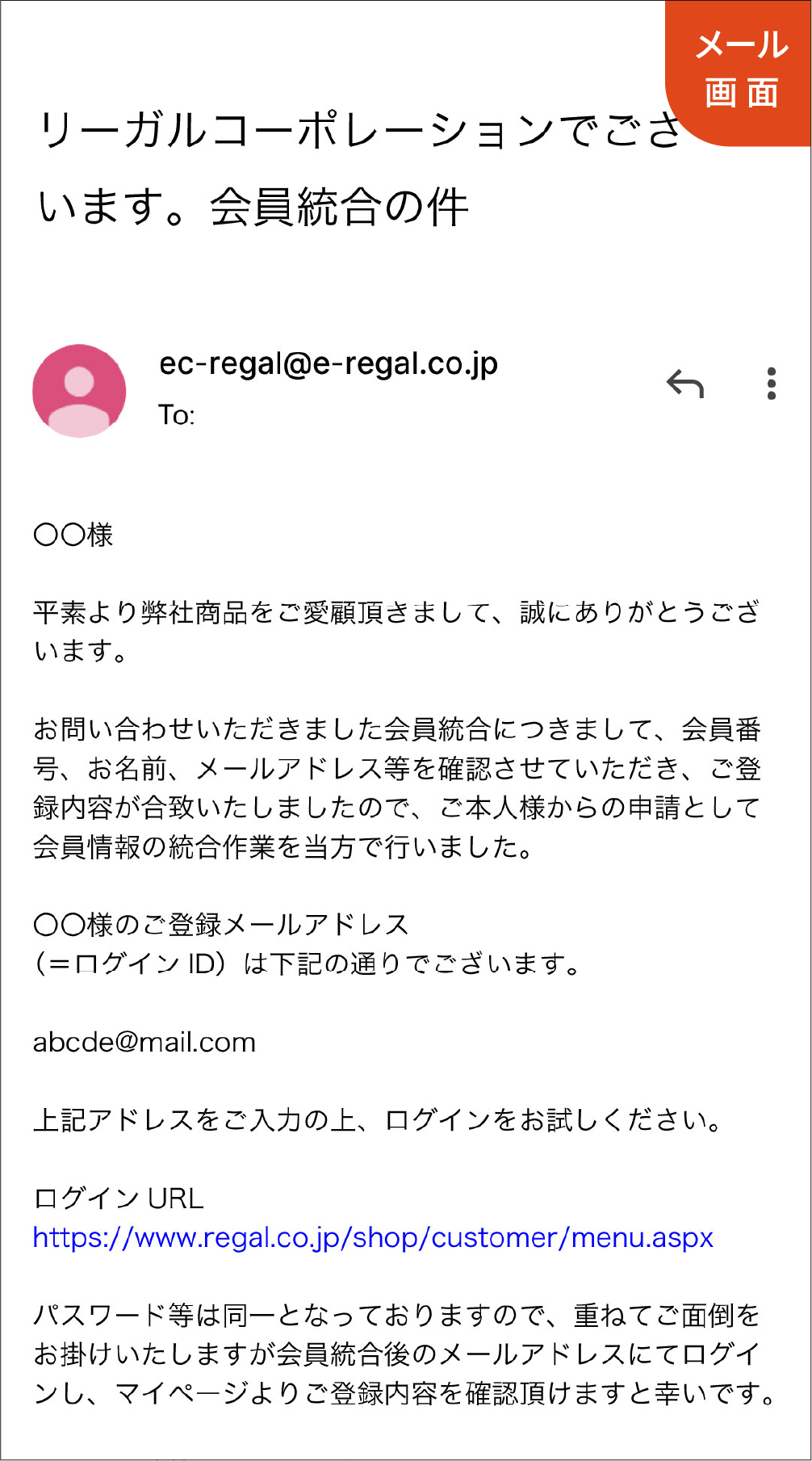 18後日当社(@e-regal.co.jp)から統合完了のメールが届きます※統合手続き完了までお時間がかかる場合がございます。