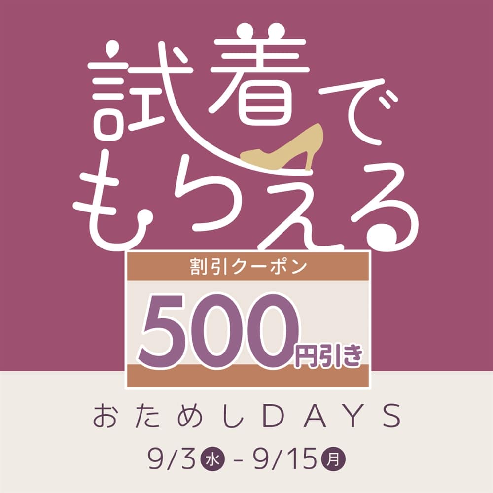 9月3日(水)~ 9月15日(月)までの期間中、キャメロット店舗にて「キャメロットお試しDAYS」を開催します。婦人靴を「ご試着」いただくと、今すぐ使える500円割引クーポン(秋得券)をプレゼント!