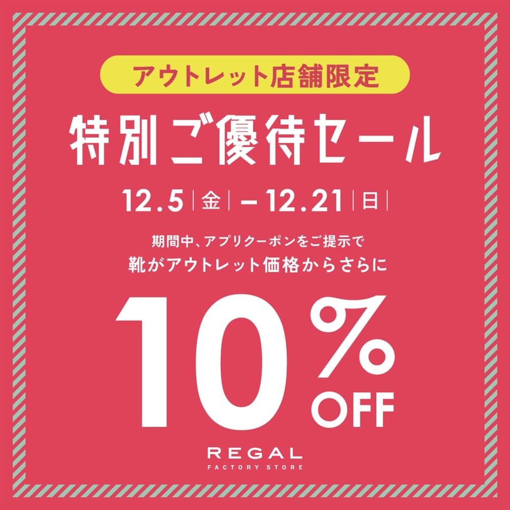 ※クーポンはリーガルコーポレーション直営のアウトレット店舗のみでご利用いただけます。