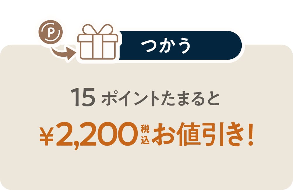 - 満了メンバーズカード(15ポイント)= 2,200円(税込)として、次回以降値引き致します。