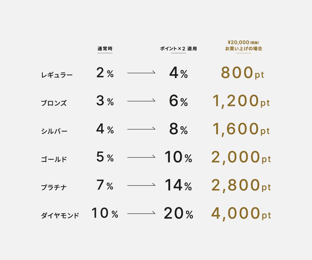 ※セール商品、修理、有料サービスは会員ランクに関わらず、ご購入金額(税抜)200円につき1ポイントの2倍(2ポイント)となります。